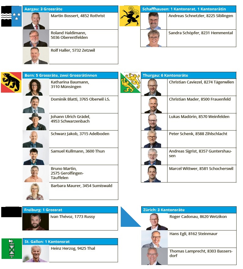 Per Ende 2024 ist die EDU in sieben kantonalen Parlamenten mit insgesamt 23 Frauen und Männern vertreten. In den letzten Jahren konnte die EDU ihre Präsenz stetig ausbauen, es besteht aber in der ganzen Schweiz noch viel Potenzial! Gewinne von weiteren Sitzen sind nur möglich, wenn sich in den Sektionen möglichst viele EDU-Mitglieder als Kandidaten zur Verfügung stellen – und der Partei damit wichtige Stimmen sichern.